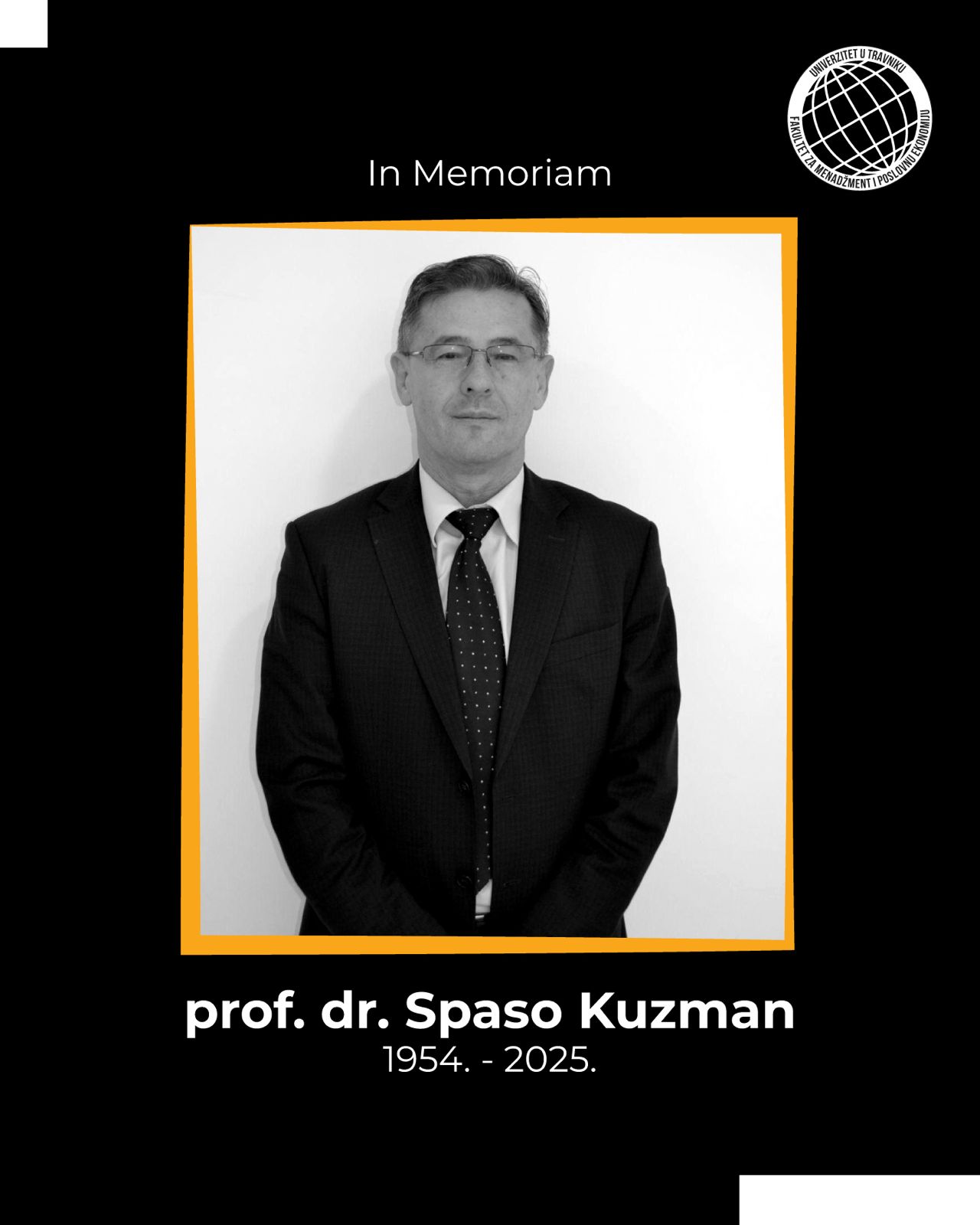S tugom i dubokim poštovanjem obavještavamo javnost da nas je napustio naš uvaženi kolega i profesor, prof. dr. Spaso Kuzman, vanredni profesor u oblasti računovodstva i finansija na Fakultetu za menadžment i poslovnu ekonomiju Univerziteta u Travniku. Profesor Kuzman bio je izuzetan pedagog, naučnik i kolega koji je svojim znanjem, iskustvom i ljudskošću ostavio neizbrisiv trag među studentima i akademskim osobljem. Autor je brojnih naučnih radova i publikacija, među kojima se posebno izdvajaju knjige Finansijski menadžment (2019), Analiza poslovanja (2024) i Due diligence – aspekt poreznog posmatranja (2024). Svojim nesebičnim zalaganjem, predanošću i toplinom inspirisao je generacije studenata i dao značajan [...]