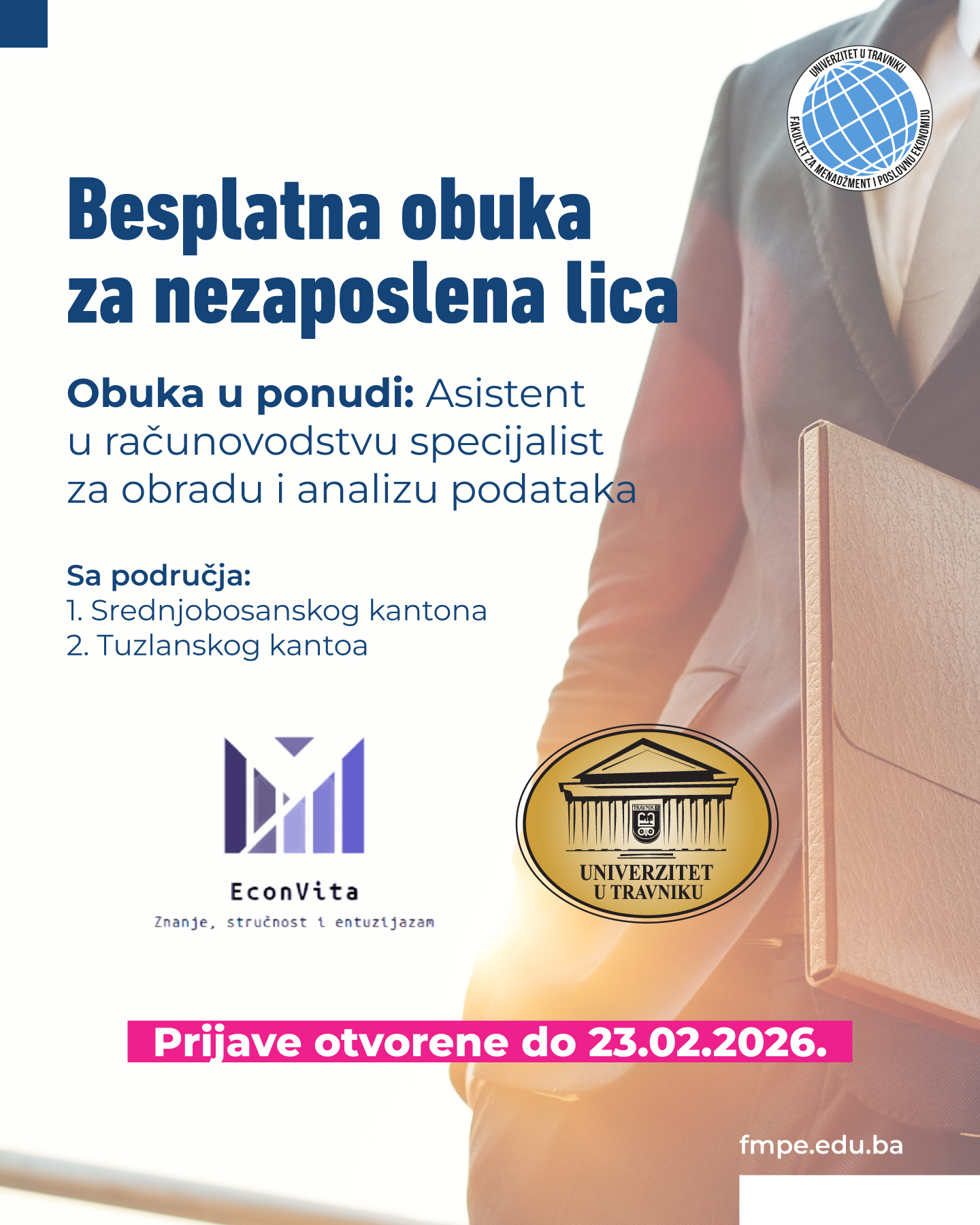 U okviru programa koji realizuje Federalni zavod za zapošljavanje, a koji ima za cilj profesionalno usavršavanje i brže zapošljavanje nezaposlenih osoba, Univerzitet u Travniku u saradnji sa Udruženjem EconVita objavljuje javni poziv za prijavu na dvije besplatne stručne obuke.